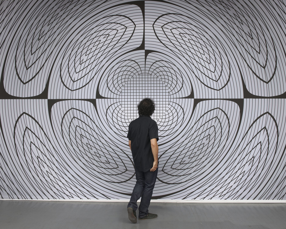 In these wall pieces I started exploring curved spaces: hyperbolic and manifold spaces, taking a flat grid, distorting it in a curved mirror, then flattening it out again onto the wall.