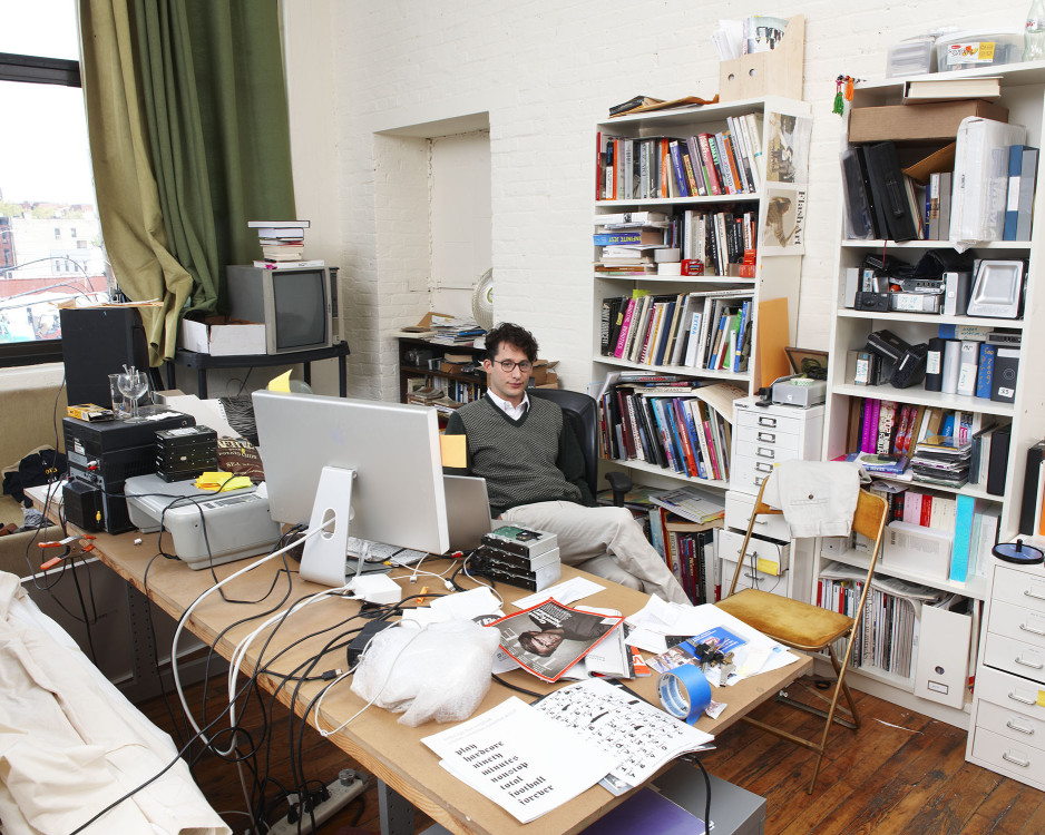 Here I am sitting in my old studio at 5 Delavan Street in Red Hook, Brooklyn. I remember the day Jason came over to take this picture. I greeted him outside my door with a white, unbuttoned shirt on and speaking in an Israeli accent. We laughed a lot. I was glad Jason thought it was funny because I like him. What I'm wearing in this picture was a gift from my mother. She took me shopping at Brooks Brothers after I returned exhausted from a string of shows in London and Berlin. She also bought me the glasses I have on. You can see how messy this studio is. All the things on the desk were just there, but now, looking at this photo, the arrangement seems really intentional—almost ironic—or like part of a portrait of who I could be.